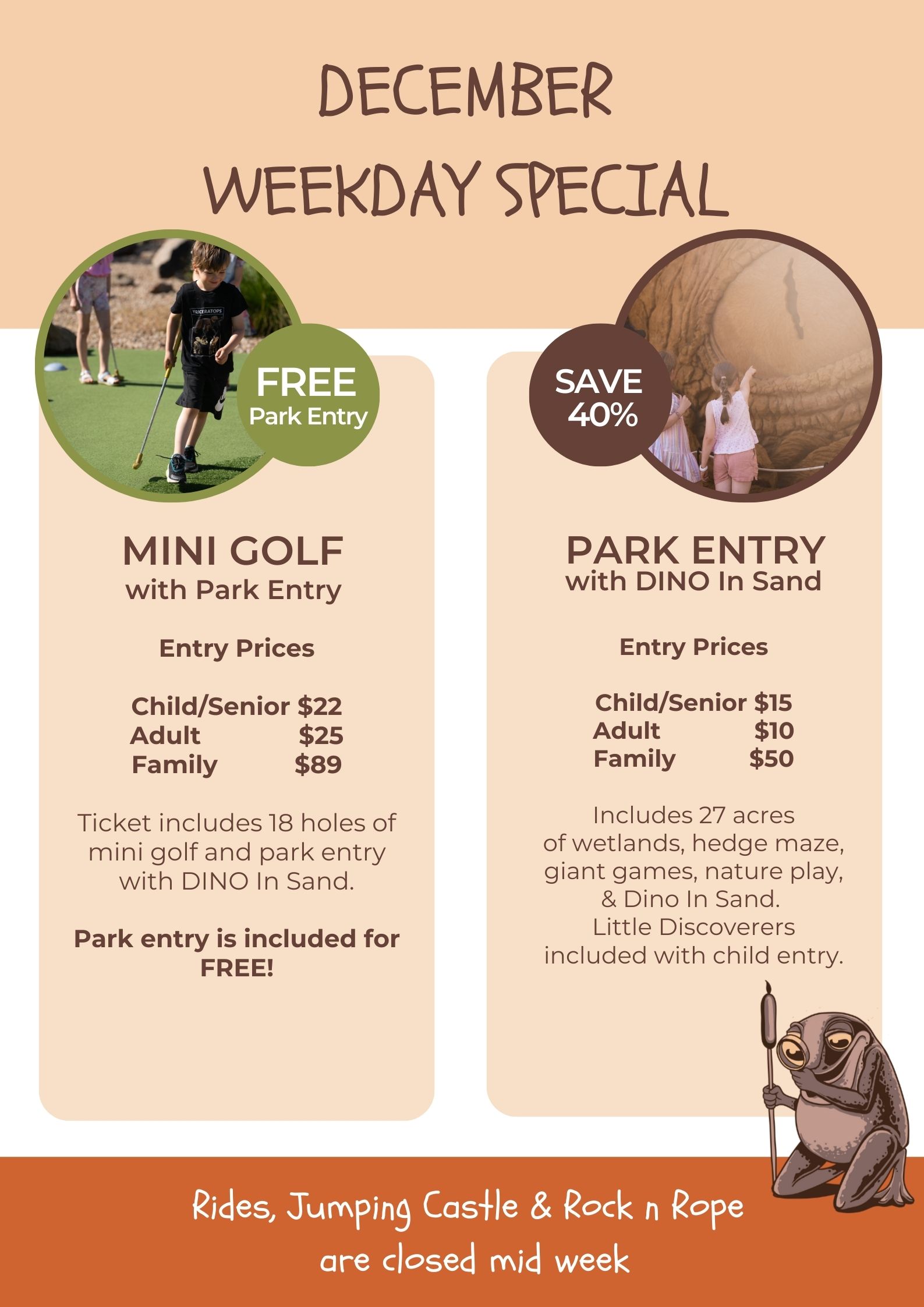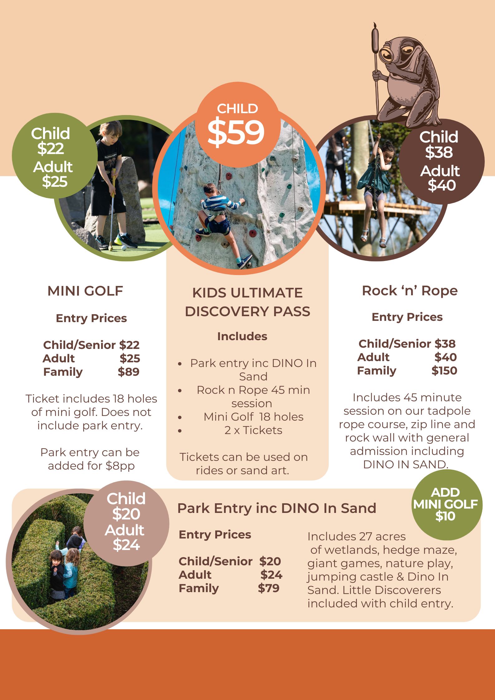 Discover the best way to explore Boneo Discovery Park, whether it’s a round of mini golf, a journey through the prehistoric world of sand at DINO IN SAND, or a full day of fun with the Kids Ultimate Discovery Experience. We have something for everyone.